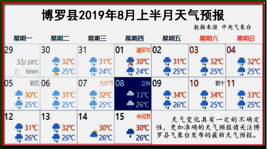 8月8日立秋,8月1號至8月15號氣溫24-34℃,雨天較多,天氣多變,敬請關注縣氣象臺發布的最新天氣預報,根據實際天氣情況安排農業生產。