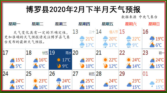 2月19日雨水。16日—29日期間氣溫5—25℃,15號之后期氣溫急劇下降,請注意防寒保暖,聽從疫情防控部門指導意見,確保自身健康。近期天氣多變,請密切關注縣氣象臺發布的最新預警信息,適時安排農業生產工作。
