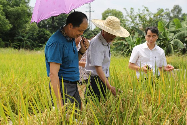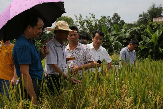 在觀摩現場,金黃飽滿的稻穗低頭害羞地藏在腰桿挺直的葉子之下,在夏日的艷陽中一片金燦燦。微風拂過,一陣清新的稻香彌漫在空氣中。觀摩人員深入田間,對各品種的特征特性、產量表現及抗逆性等情況進行現場觀摩和評鑒,不時點頭稱贊。經綜合評定,黃廣油占、象牙香占、華航52及合莉油占等優質高產品種綜合性狀表現良好,推薦作為今年重點示范推廣品種。