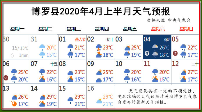 4月4日清明,1—15日,氣溫15-29℃。據(jù)新華社3月28日報道,今年我國3月28日入汛,較多年平均入汛日期(4月1日)提前4天。水利氣象部門聯(lián)合會商,總體意見是,今年汛期我國降雨偏多,呈現(xiàn)南北多中間少的特點,江淮西部及東北、西北、西南的部分地區(qū)可能出現(xiàn)干旱。進入汛期意味著進入了強降水集中期,降雨將強度更大、歷時更長,突發(fā)洪澇災(zāi)害事件隨時可能發(fā)生,天氣形勢更加復(fù)雜多變,極端天氣事件將明顯增多,更加難以精確作出預(yù)測預(yù)報。請密切關(guān)注縣氣象臺發(fā)布的最新天氣預(yù)報,根據(jù)實際天氣情況安排農(nóng)業(yè)生產(chǎn)。