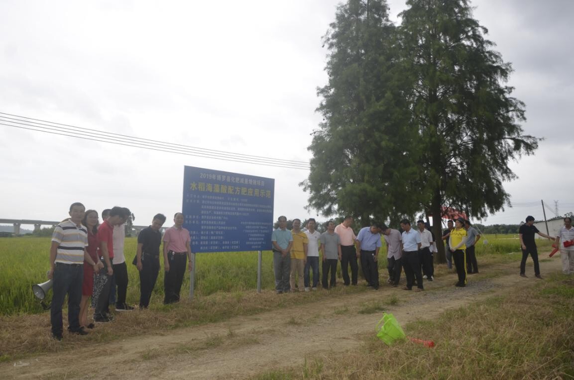 參會人員首先到泰美鎮秀嶺村現場參觀千畝海藻酸肥水稻直播示范基地。海藻酸肥是以海洋植物海藻作為主要原料,通過添加生物提取海藻素和水稻養分需求規律研制水稻配方增值復合肥料,具有刺激根系發育和增強抗逆性,提高肥料吸收利用,從而實現水稻化肥減量增效生產。