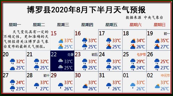 8月16日~8月31日,氣溫23~34℃,晝夜溫差較大,天氣不穩定,時有雷電、短時強降水等強對流天氣,敬請關注縣氣象臺發布的最新天氣預報,根據實際天氣情況安排農業生產。