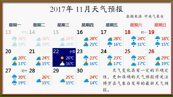 16到30號(hào)天氣以陰天和小到中雨為主,后期受冷空氣影響,有明顯大風(fēng)降溫過(guò)程。氣溫11-30℃,晝夜溫差較大。更加準(zhǔn)確的天氣預(yù)報(bào)請(qǐng)關(guān)注縣氣象臺(tái)發(fā)布的最新天氣預(yù)報(bào)。