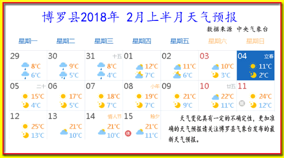 2月4日立春,氣溫2—25℃,晝夜溫差較大。請關注縣氣象臺發布的最新天氣預報,做好防寒工作。