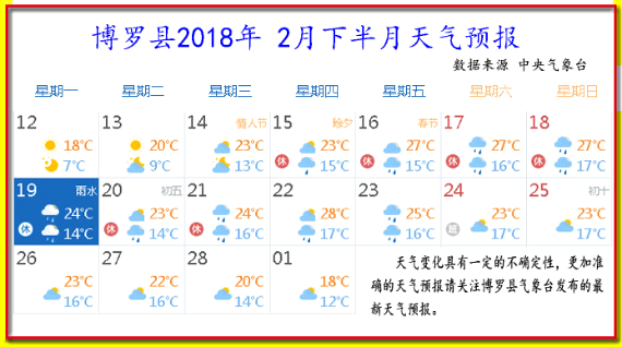2月19日雨水。15日—28日期間氣溫14—28℃,陰雨和多云天氣為主,氣溫回升,濕度增大,雨水增多,冬季干冷天氣即將結束。請關注縣氣象臺發布的最新寒潮和降雨預警信息,及時做好防寒、防澇工作。