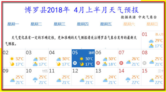 4月5號春分,1—15號,氣溫17-32℃。請關注縣氣象臺發布的最新天氣預報,根據實際天氣情況安排農業生產。