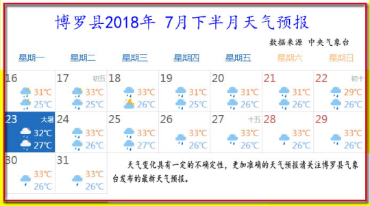 本月23號大暑,16—31號氣溫25—33℃,天氣多變,敬請關注縣氣象臺發布的最新天氣預報,根據實際天氣情況安排農業生產。