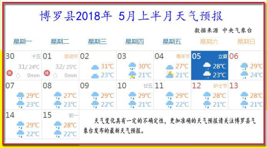 5月5日立夏,1—15號,氣溫21-32℃。請關(guān)注縣氣象臺發(fā)布的最新天氣預(yù)報,根據(jù)實際天氣情況安排農(nóng)業(yè)生產(chǎn)。
