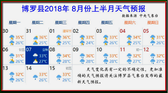 8月7日立秋,8月1號至8月15號氣溫24-36℃,天氣多變,敬請關注縣氣象臺發布的最新天氣預報,根據實際天氣情況安排農業生產。