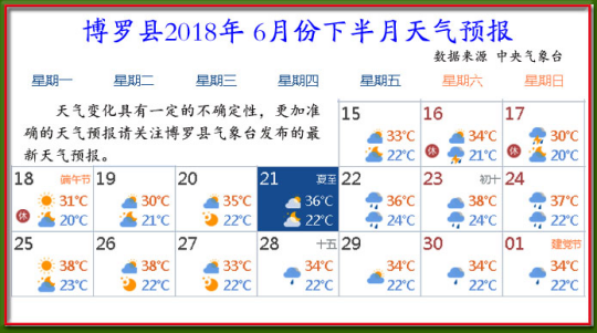 6月21日夏至,15—30號,氣溫20-38℃,天氣多變,敬請關注縣氣象臺發布的最新天氣預報,根據實際天氣情況安排農業生產。