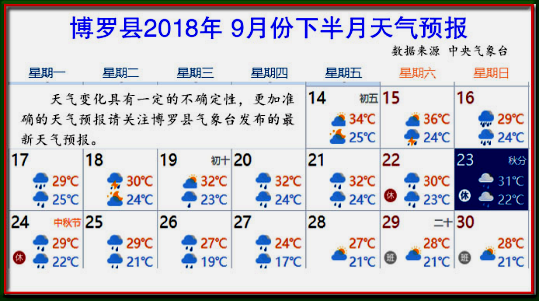 9月16號至9月30號氣溫17~32℃。當(dāng)前我縣正值暴雨和強對流天氣多發(fā)季節(jié),天氣變化節(jié)奏快,請密切留意縣氣象臺發(fā)布的最新天氣預(yù)報預(yù)警信息。