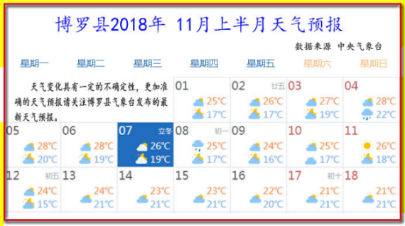 11月1日到15日天氣晴天到多云為主,氣溫15-28℃,晝夜溫差較大,請關注縣氣象臺發布的最新天氣預報,巧用天時搞好農業生產。