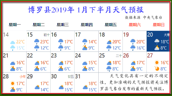 1月20日大寒,16~31日期間氣溫6~20℃,晝夜溫差較大。天氣變化具有一定的不確定性,請關注縣氣象臺發布的最新天氣預報,根據實際天氣情況安排農業生產。