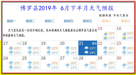 6月21日夏至,16—30號,氣溫23-33℃,天氣多變,敬請關(guān)注縣氣象臺發(fā)布的最新天氣預(yù)報,根據(jù)實際天氣情況安排農(nóng)業(yè)生產(chǎn)。