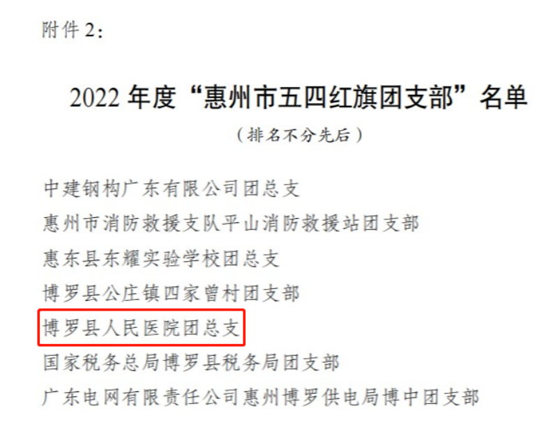 為表彰先進、樹立典型,激勵各級團組織和廣大團員、團干部向先進學習、向優秀看齊,近日,共青團惠州市委員會決定表彰一批先進個人及集體,其中,共青團博羅縣人民醫院總支部委員會榮獲2022年度“惠州市五四紅旗團支部”稱號。