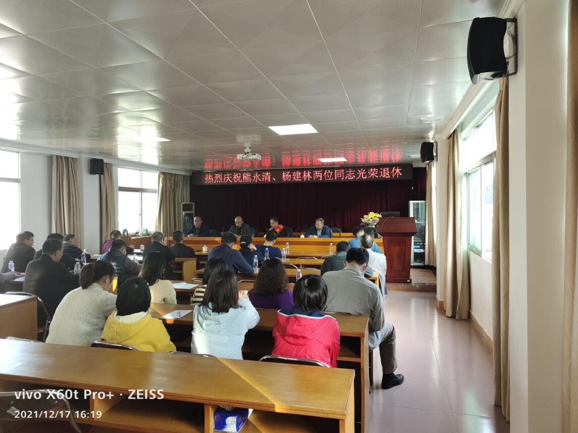 12月17日下午16點,縣畜牧獸醫事務中心組織召開了慶祝熊永清,楊建林兩位同志光榮退休儀式,會議由中心副主任劉少球主持,中心主任鄒勇,副主任梁水清,中心全體工作人員參加會議。