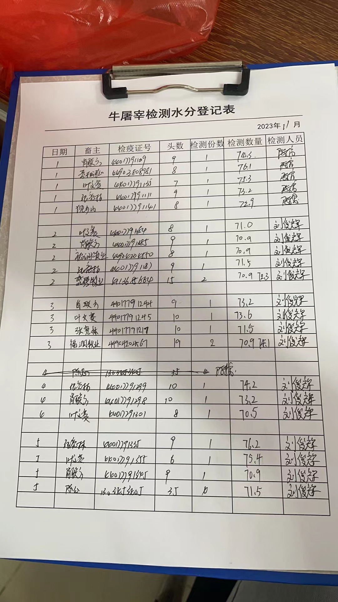 為有效防范“灌水活牛”進入我縣屠宰場,保障上市牛肉產品質量安全,近日,縣畜牧獸醫事務中心對全縣的活牛屠宰場開展專項檢查。一是重點對來自東莞橫瀝牛行的活牛運輸車輛的備案、GPS運行軌跡、一次性封簽等情況進行查驗,對車輛未備案、封簽破損、GPS軌跡異常的一律不準入場屠宰。二是按照《牛屠宰檢疫規程》的要求,加強對待宰欄活牛的巡查,對宰前檢查異常的及時調取監控并采取相應的處置措施,嚴防在屠宰場內進行活牛“灌水”等行為。三是嚴格落實水分檢測,對屠宰后的牛肉實施“批批檢、每批抽檢率不低于10%”現場抽檢制度,對水分檢測不合格的產品全部進行無害化處理,并做好臺賬記錄。