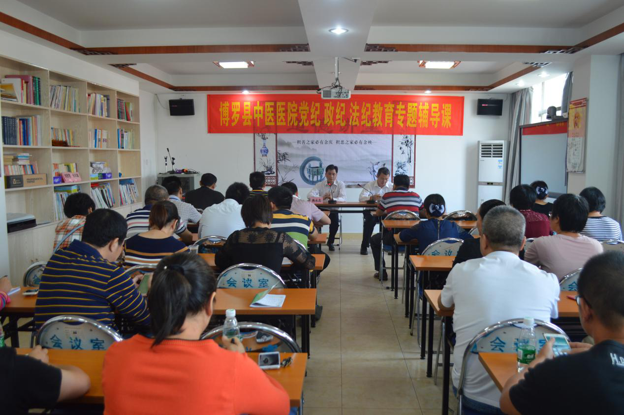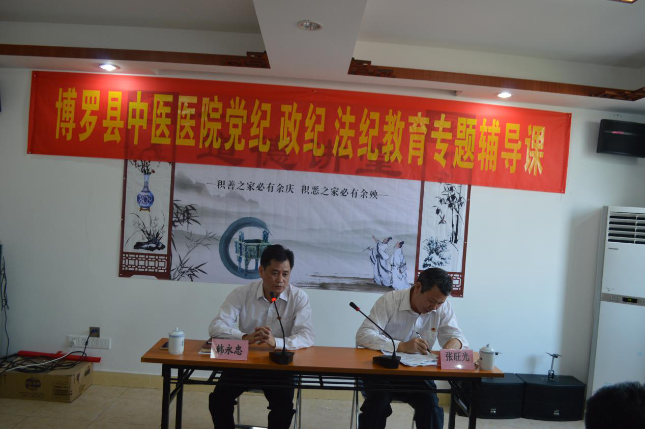 2017年10月24日下午在我院六樓會議室舉辦黨紀、政紀、法紀教育專題輔導課,我院全體在職黨員、中層以上干部以及重要職能部門工作人員共60余人參加此次會議,會議由支部書記、院長韓永忠同志主持,并邀請縣紀委派駐縣衛計局紀監組組長張旺光同志作專題輔導報告。