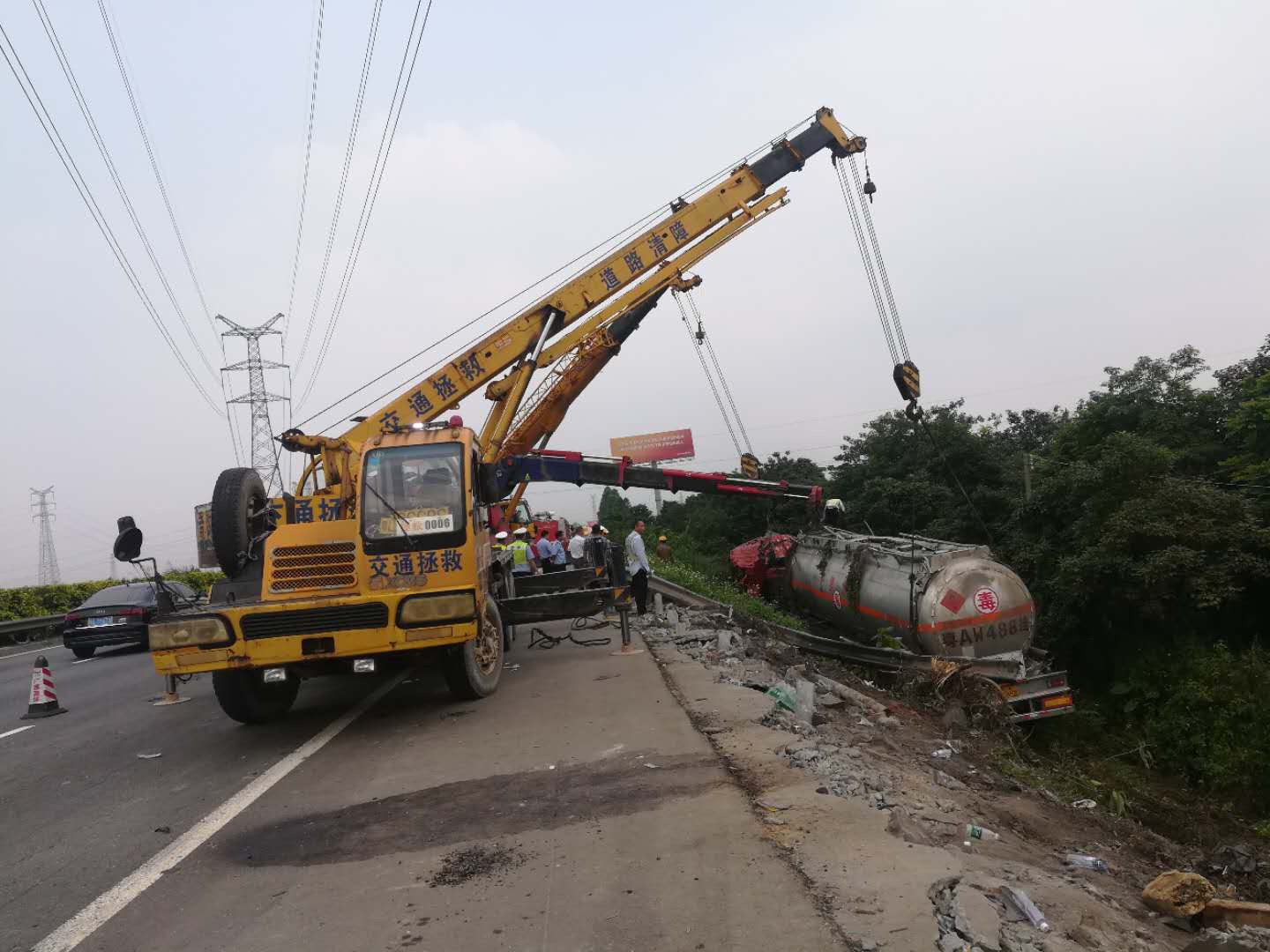 3時(shí)10分開始用三個(gè)大型吊車將事故槽罐車吊離現(xiàn)場(chǎng),三個(gè)大型吊機(jī)相互配合,將事故槽罐車緩慢調(diào)離事故點(diǎn)前方50米處,17時(shí)40分兩臺(tái)吊車將事故槽罐車吊裝扶正至高速公路外側(cè),17時(shí)50分高速公路實(shí)現(xiàn)兩車道通行,18時(shí)事故事故槽罐車開始拖離事故現(xiàn)場(chǎng),隨后交通全面恢復(fù),事故成功處置完成。