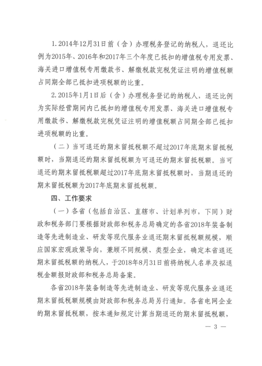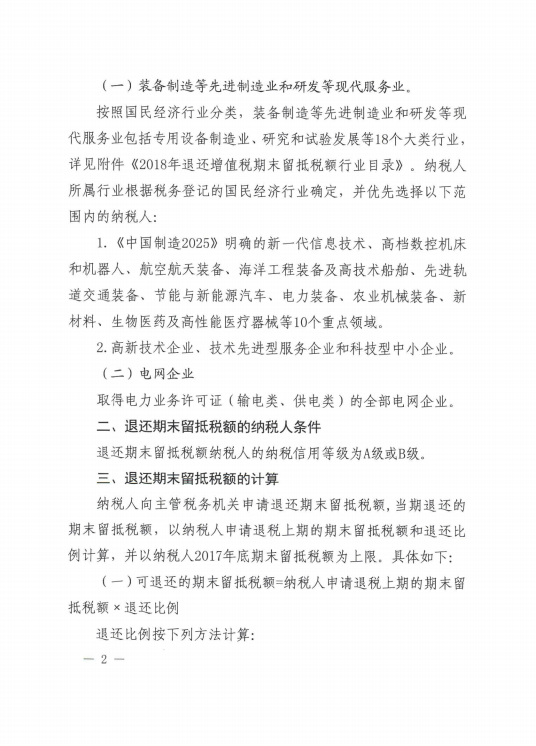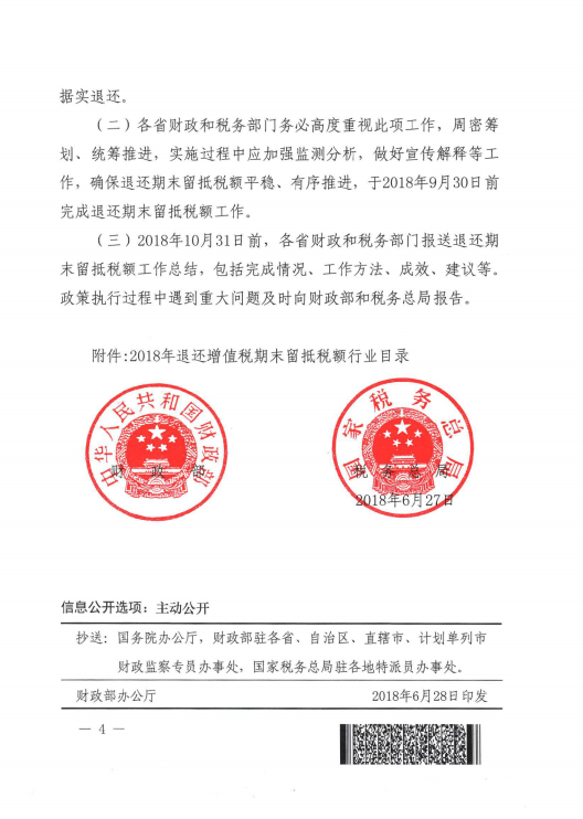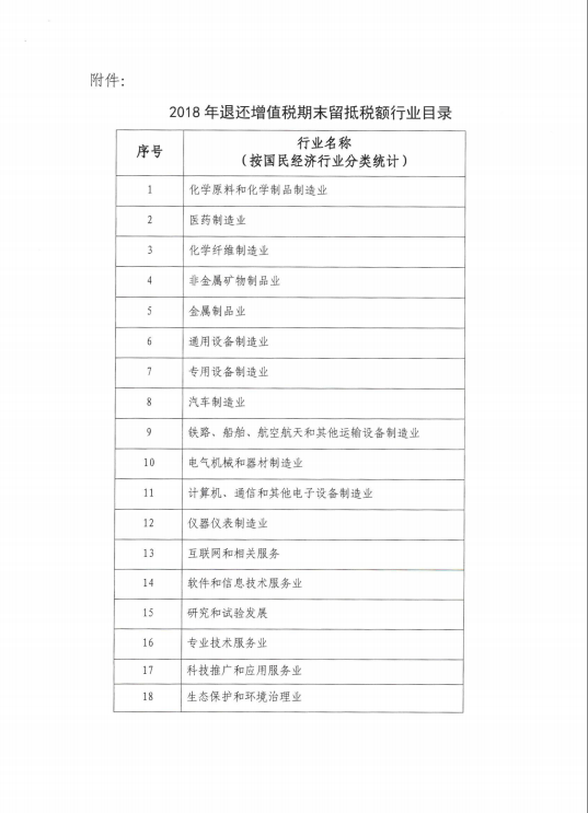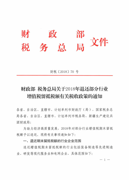 財政部 稅務總局關于2018年退還部分行業增值稅留抵稅額有關稅收政策的通知