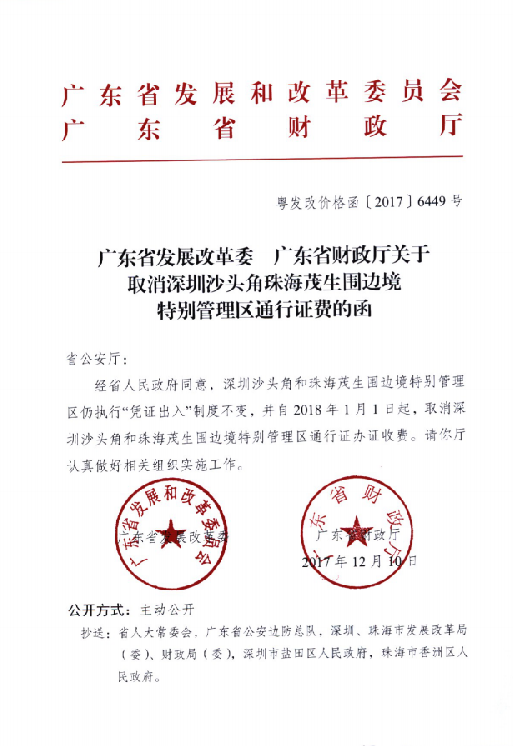 廣東省發展改革委 廣東省財政廳關于取消深圳沙頭角珠海茂生圍邊境特別管理區通行證費的函