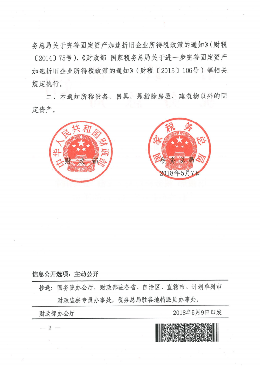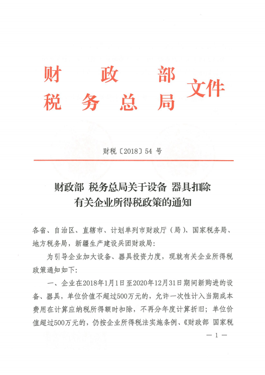 財政部 稅務總局關于設備 器具扣除有關企業所得稅政策的通知