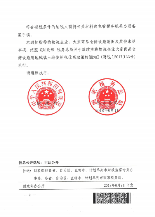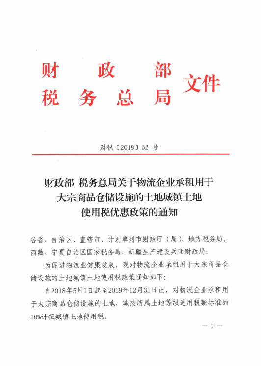 財政部 稅務總局關于物流企業承租用于大宗商品倉儲設施的土地城鎮土地使用稅優惠政策的通知