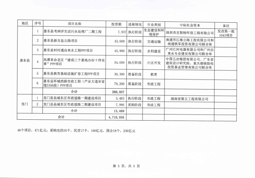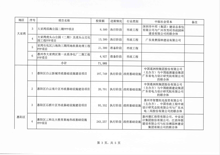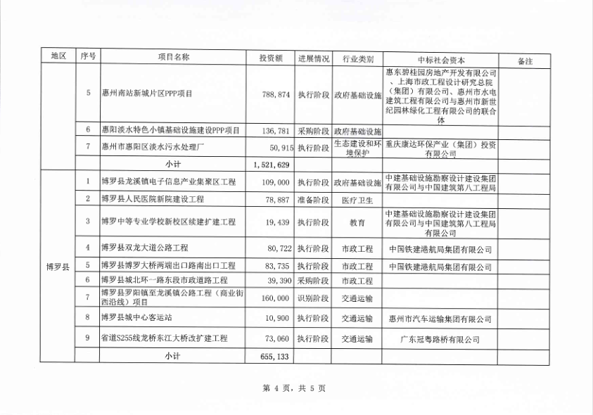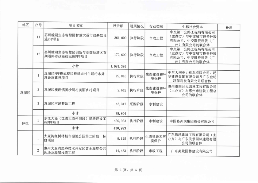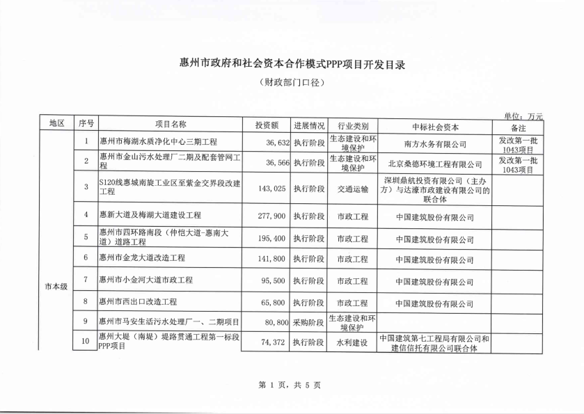 惠州市政府與社會資本合作模式PPP項目開發(fā)目錄