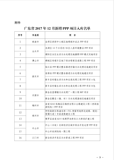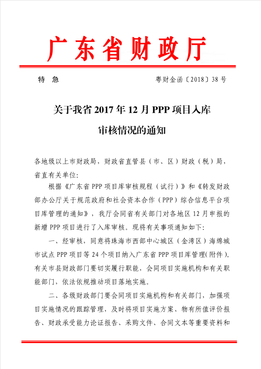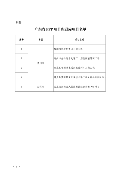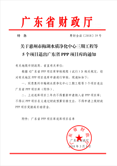 《關(guān)于我省2017年12月PPP項目入庫審核情況的通知》、《關(guān)于惠州市梅湖水質(zhì)凈化中心三期工程等5個項目退出廣東省PPP項目庫的通知》
