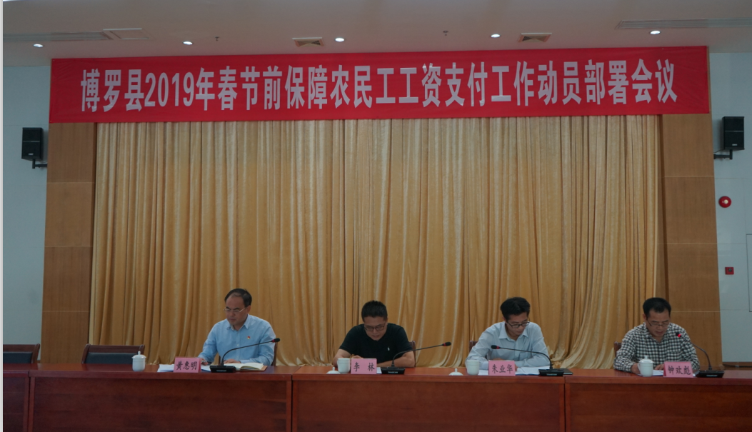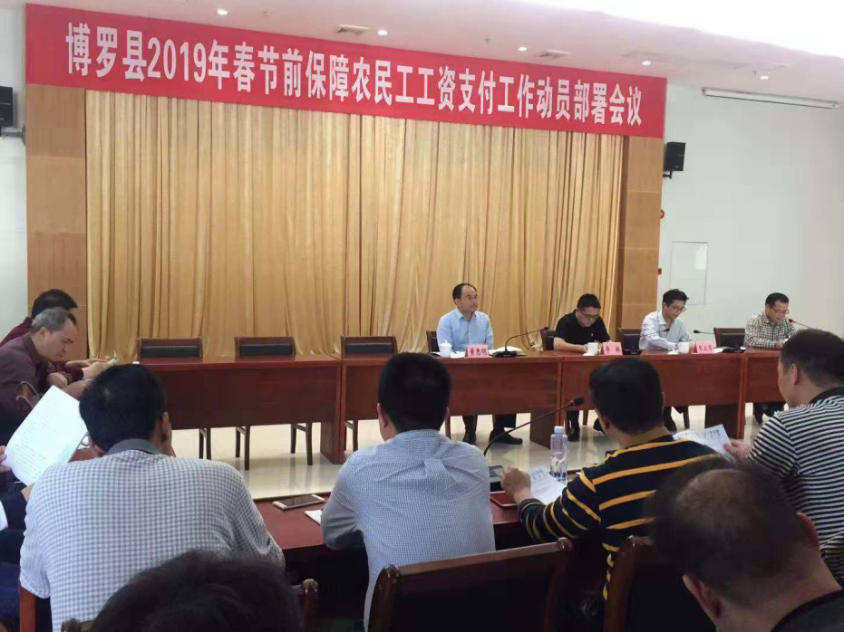 為傳達貫徹好全國和全省關于做好2019年春節前保障農民工工資支付工作視頻會議和市工作會議精神,做好我縣2019年春節前保障農民工工資支付工作,確保我縣歲末年初農民工工資的按時足額發放,高高興興回家過年,切實維護農民工的合法權益,促進我縣的社會穩定。近日,博羅縣召開春節前保障農民工工資支付工作動員部署會議。縣政府副縣長李林、政府辦副主任朱業華出席了會議。縣人社局、縣發改局、縣公安局、縣司法局、縣財政局、縣住建局、縣交通運輸局、縣水務局、人民銀行博羅支行、縣市場監督管理局、縣工商聯、縣總工會等單位分管領導,各鎮(羅浮山管委會、街道辦)分管領導,各鎮(街道辦)人社所所長、縣人社局有關股室人員參加了會議。