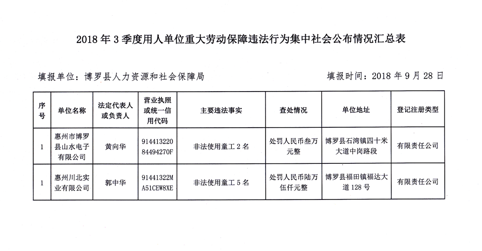 2018年第3季度用人單位重大勞動保障違法行為集中社會公布情況匯總表