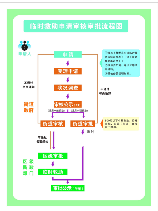 鄉(xiāng)鎮(zhèn)人民政府、街道辦事處應當在受理臨時救助申請的五個工作日內(nèi),對臨時救助申請人的家庭進行入戶調(diào)查核實,提出審核意見,并將相關內(nèi)容進行公示,公示期為三天。公示期滿后,鄉(xiāng)鎮(zhèn)人民政府、街道辦事處應當將申請材料、家庭經(jīng)濟狀況調(diào)查材料報送縣級人民政府民政部門審批。 縣級人民政府民政部門應當自收到鄉(xiāng)鎮(zhèn)人民政府、街道辦事處審核意見和相關材料的三個工作日內(nèi)作出審批決定。批準給予臨時救助的,應當同時確定救助方式和金額;不予批準的,應當在三個工作日內(nèi),通過鄉(xiāng)鎮(zhèn)人民政府、街道辦事處書面告知申請人并說明理由?!?/span>