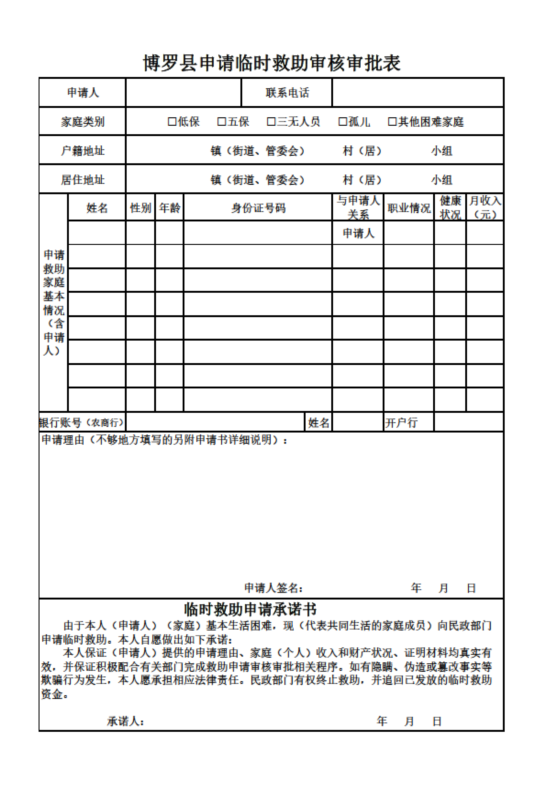 《臨時救助申請審核審批表》 | 原件:1 材料必要性:必要 材料備注:簽名、相關部門蓋章 | 申請人 | 無 | 中介辦理 | |