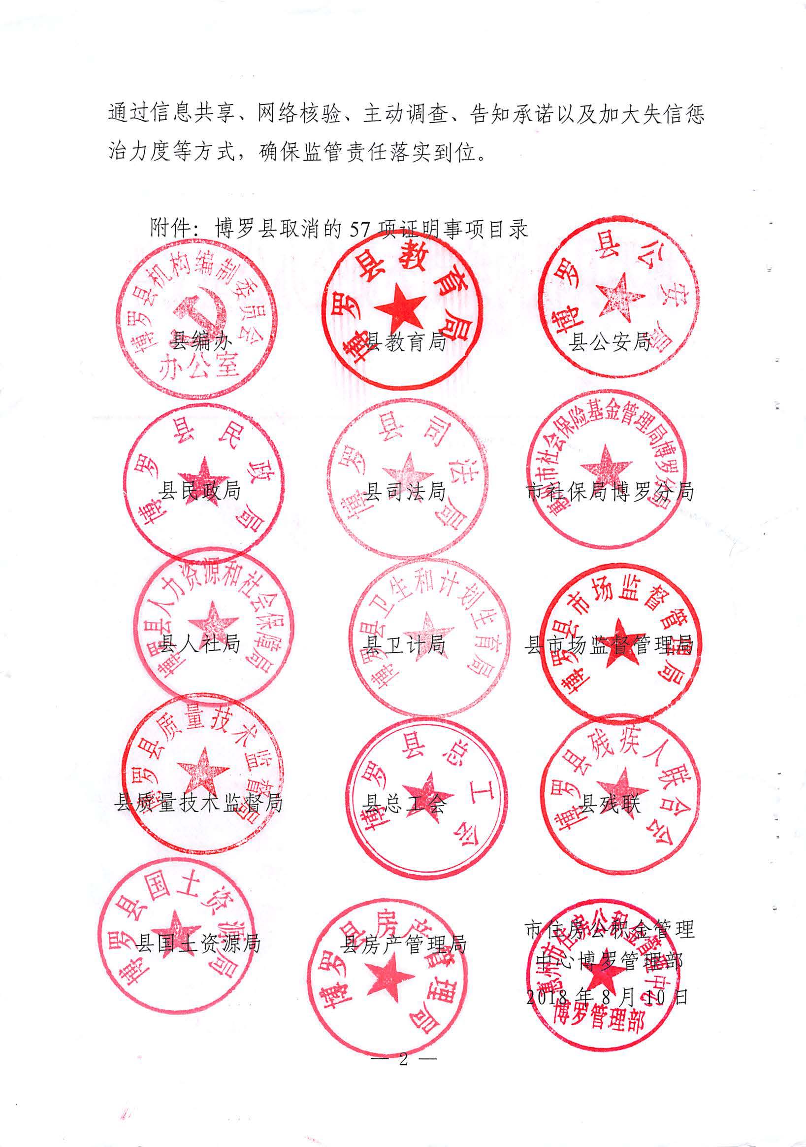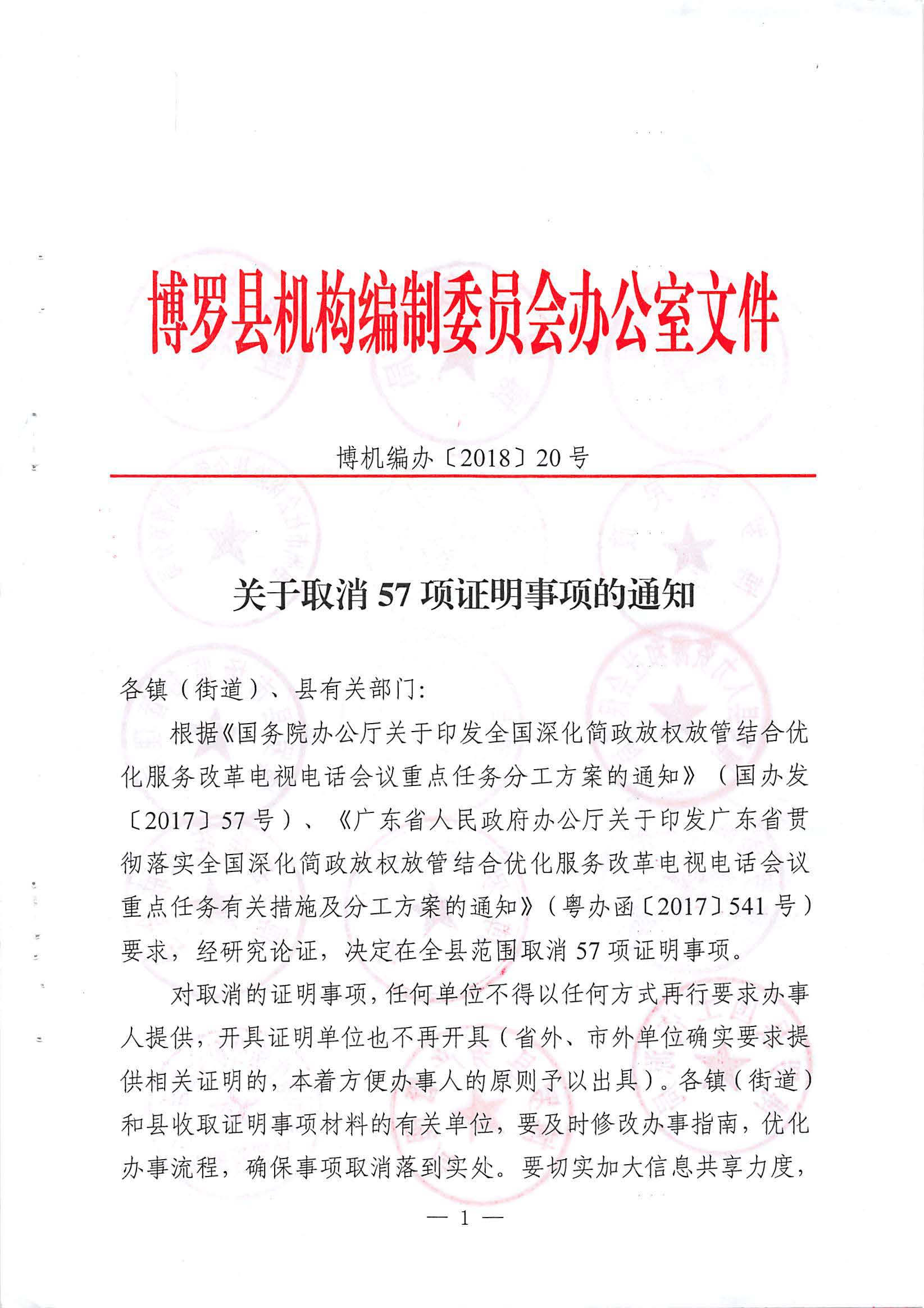 博羅縣--關于取消57項證明事項的通知(博機編辦〔2018〕20號)