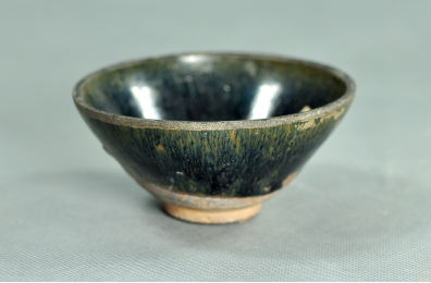 口沿外斂內折,深腹,矮圈足,外壁上半部分掛黑釉,底部處理粗糙 ,不施釉。
