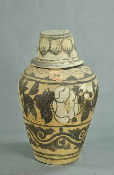 小口,直唇,高頸,鼓腹,矮圈足。圓蓋鼓頂,中間置一寶珠,內有子口,頸為波濤紋。上肩繪蓮花瓣紋一周。腹繪四季纏枝花。