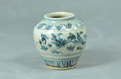 青花罐頸部一圈樹葉紋,罐體中部青花折枝蓮紋,釉面潔凈。