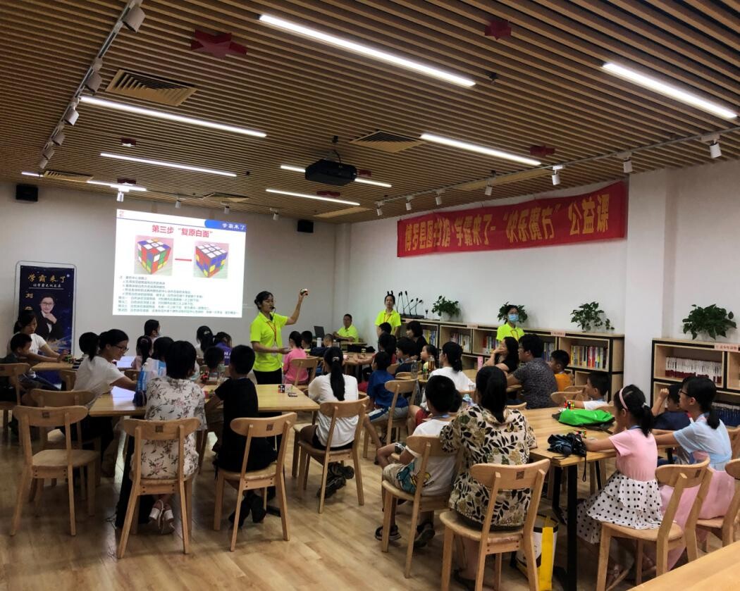 為進(jìn)一步推廣全民閱讀活動,營造良好的社會閱讀氛圍。8月2日,博羅縣圖書館在一樓培訓(xùn)室開展快樂魔方公益課第二期第二節(jié)課活動。課程開始前,劉老師復(fù)習(xí)上周所學(xué)的步驟,并且讓同學(xué)們之間相互打亂魔方且復(fù)原,然后正式進(jìn)入第二次課的主講內(nèi)容——第三步:“復(fù)原白面”。在練習(xí)過程中,有復(fù)原的比較快的同學(xué)主動當(dāng)起了小老師,去幫助身邊復(fù)原較慢的同學(xué),同學(xué)之間互相幫助,互相交流,十分團(tuán)結(jié),營造了和諧的氛圍。