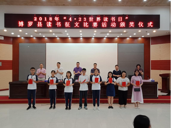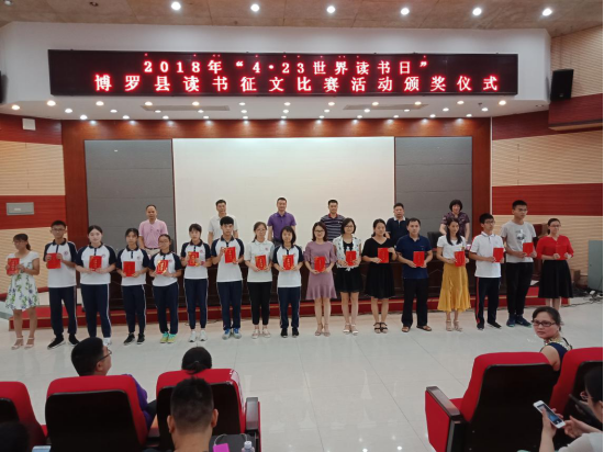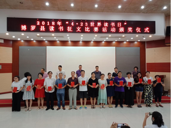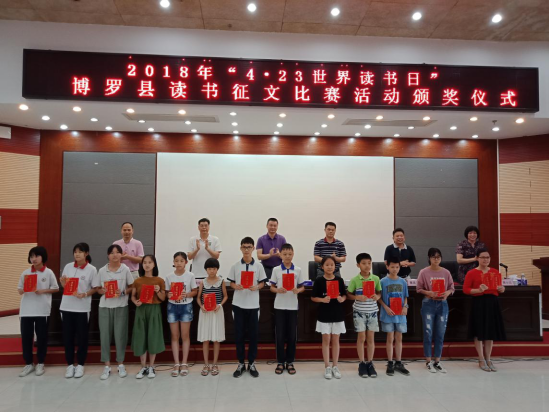 6月3日,在博羅縣報告廳舉行“2018年4.23世界讀書日”征文優秀作品頒獎活動。參加頒獎活動的領導有:縣委宣傳部副部長、縣文聯主席吳志東,惠州市慈云圖書館館長李志鴻,縣文體旅游局局長朱炳文,縣教育局副局長曹善開,縣文體旅游局紀檢監察員林繼偉,縣圖書館館長、縣圖書館理事會副理事長黃小蘭及縣圖書館全體干部職工。