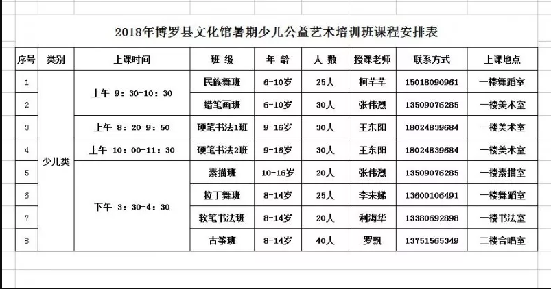 為充分發揮校外教育主陣地的作用,給我縣少兒在暑假期間提供一個學習藝術特長的場所,培養他們的創新精神、實踐能力和藝術素養,使少兒度過一個快樂、健康、有益、安全的暑假,全面提高我縣少兒的整體素質,促進我縣文化藝術工作的繁榮發展,我館將繼續開展暑期少兒公益藝術培訓課程。2018年博羅縣文化館暑期少兒公益藝術培訓班將于今年7月16日至8月3日舉辦,本期有七個項目八個班。