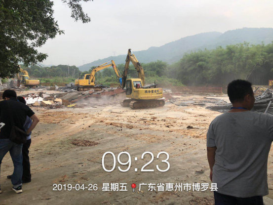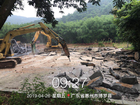 4月26日上午,縣城鄉管理和綜合執法局執法人員配合羅浮山管委會對羅浮山漂流起漂點的違章建筑進行清拆,共拆除樓房一棟,面積約一百平方,樹脂瓦棚兩個,面積共約八百平方,硬底化場地一千五百平方,出動炮機五臺,人員約二百多人。