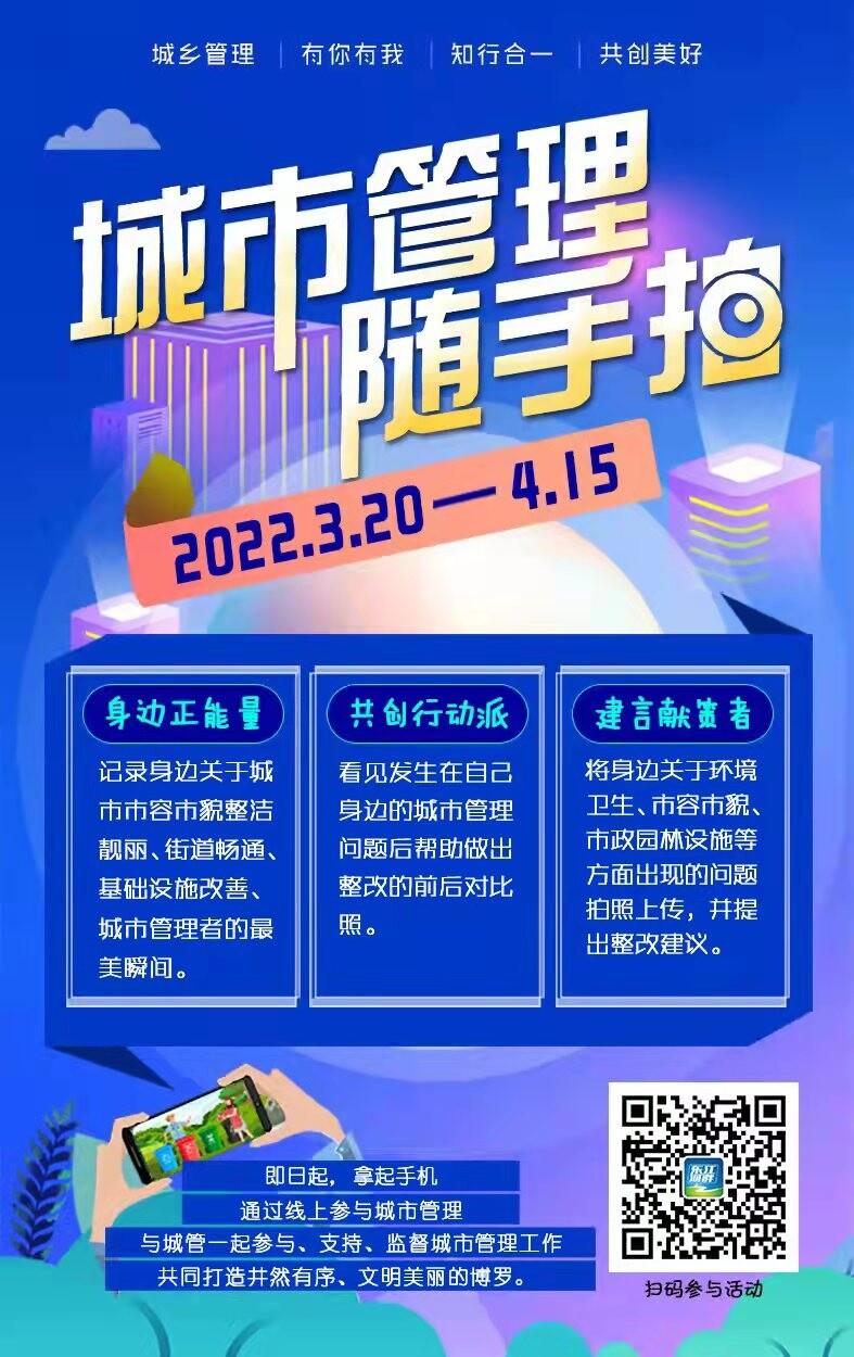 “3.19”城管宣傳日之際,我局開展2022年博羅縣“城市管理·隨手拍”有獎活動。發動廣大市民群眾線上參與城市管理,讓居民成為文明城市“巡查員”,與城管一起參與、支持、監督城市管理工作,進一步提升城市管理水平,共同打造井然有序、文明美麗的博羅。