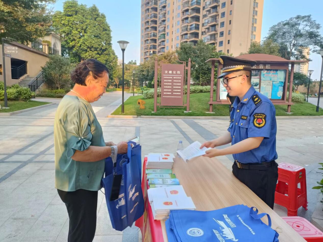 會后,城管工作人員前往東江豪門小區開展宣傳活動,向社區居民派發宣傳折頁和法律法規單行本,普及廣場舞、市容市貌、垃圾分類等相關法律知識,耐心細致地為群眾答疑解惑,引導社區居民知法守法,通過合法渠道維護權益。