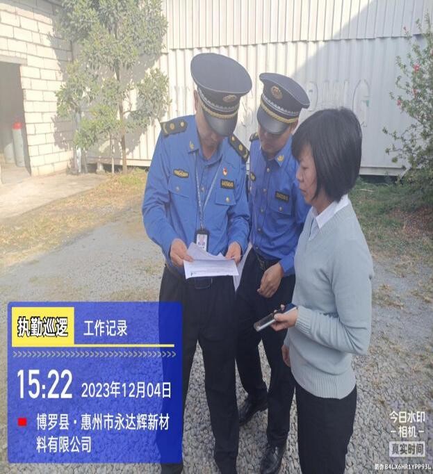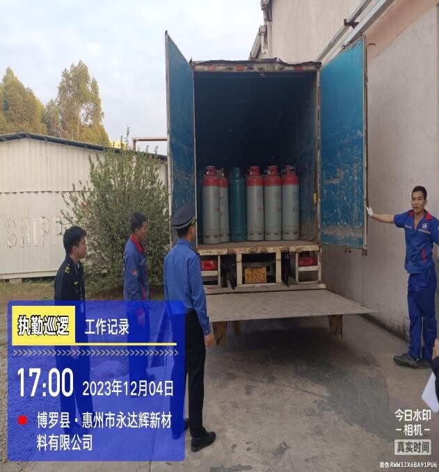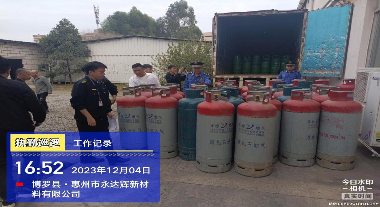 聯合檢查組根據摸排線索在泰美鎮良田村地段惠州市永達輝新材料有限公司進行檢查,經現場調查,發現該企業燃氣的供氣方為廣州積能利能源有限公司(河源東翔燃氣有限公司),涉嫌未取得燃氣經營許可證從事燃氣經營活動,違反城鎮燃氣管理條例第四十五條規定。檢查組依法下發《博羅縣泰美鎮人民政府先行登記保存證據通知書》和《先行登記保存證據物品清單》,將50kg的36個氣瓶,氣約1.2噸,就近轉移至有資質的公司先行登記保存。目前該案件已交由泰美鎮政府作進一步處理。