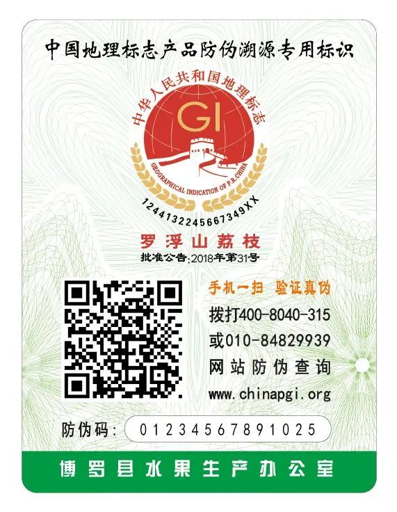 今年博羅將首次啟用地理標志專用標識,并為果農(nóng)提供10萬枚專用標識。據(jù)此地理標志專用標識顯示,每張都會印有查驗二維碼、防偽查詢網(wǎng)站、防偽碼等可供消費者溯源查詢的信息,掃碼即可查詢到包括原料、產(chǎn)地等溯源檔案,生產(chǎn)全過程信息公開透明,為消費者能品嘗到優(yōu)質“羅浮山”荔枝保駕護航。