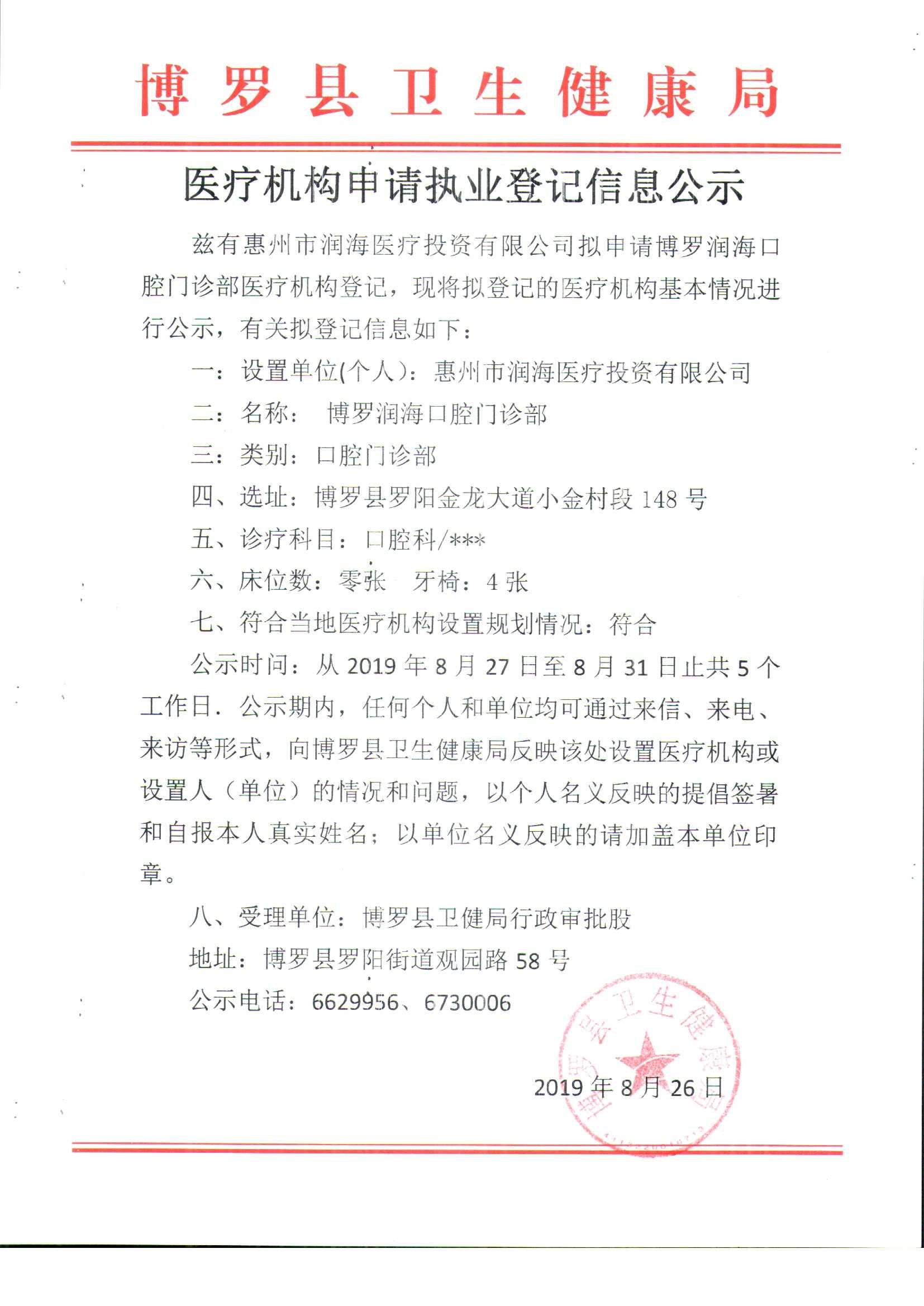 博羅縣醫(yī)療機(jī)構(gòu)申請執(zhí)業(yè)登記信息公示(2019年8月26日)