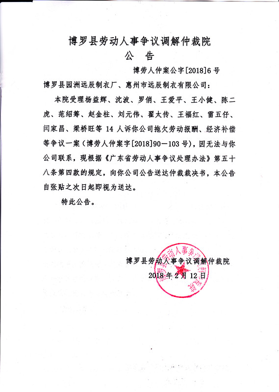 博羅縣勞動人事爭議調(diào)解仲裁院公告(博勞人仲案公字[2018]6號)