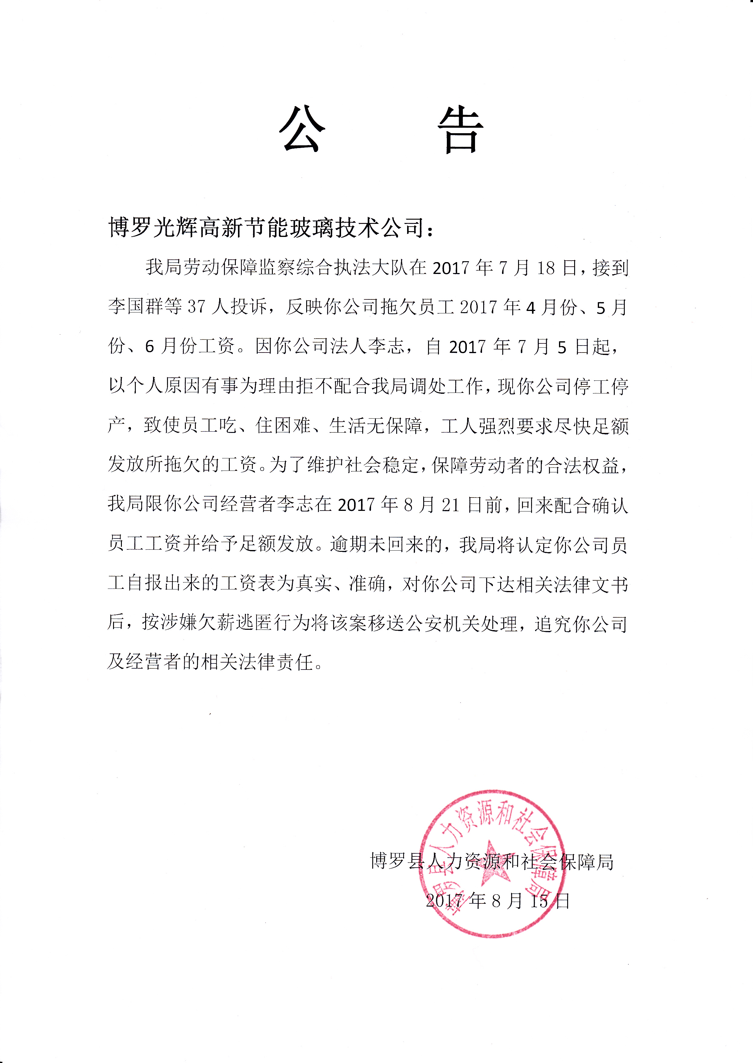 通知用人單位配合處理欠薪案件的公告(博羅光輝高新節能玻璃技術公司)