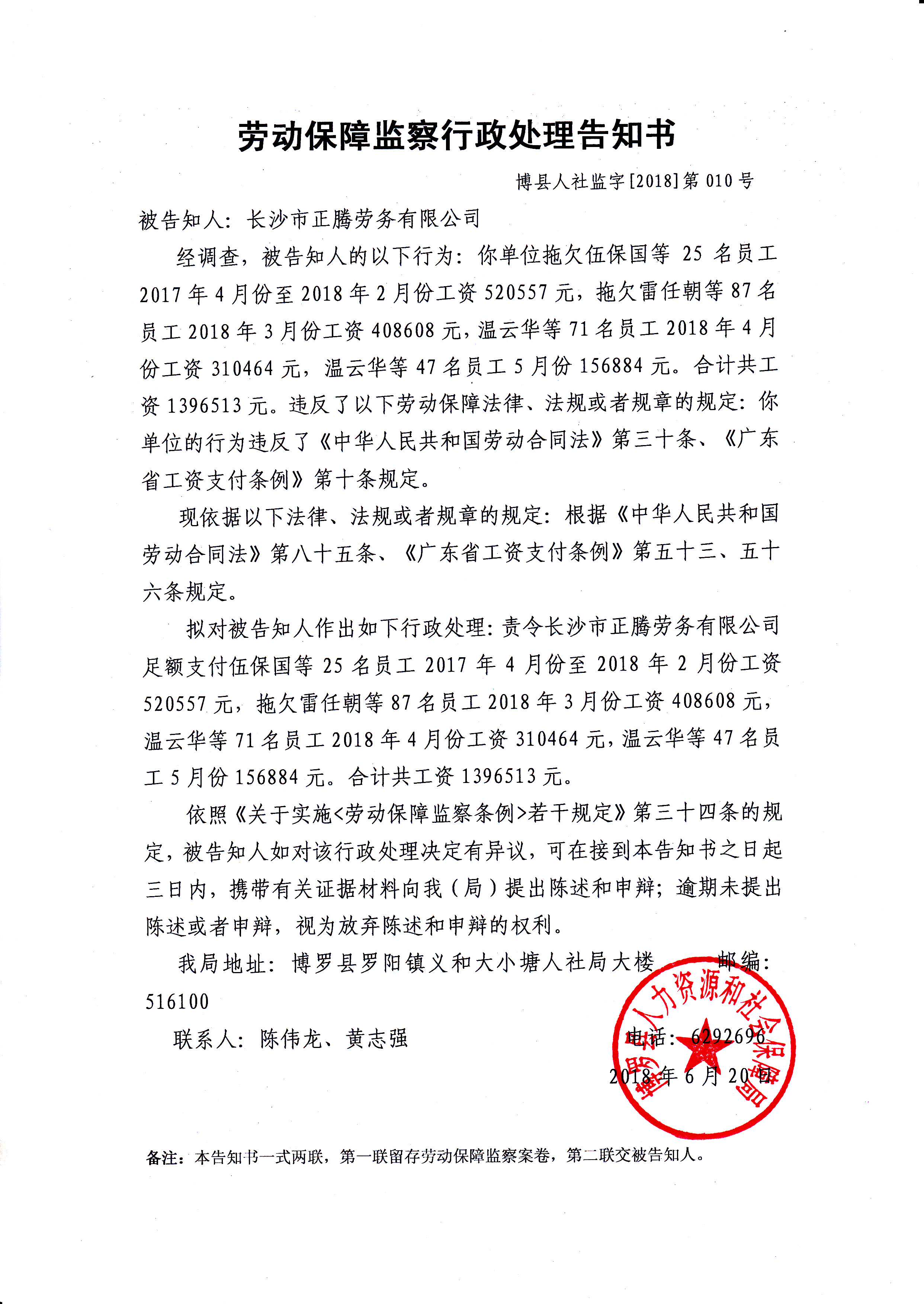 勞動(dòng)保障監(jiān)察行政處理告知書(shū)(博縣人社監(jiān)字[2018]第010號(hào))