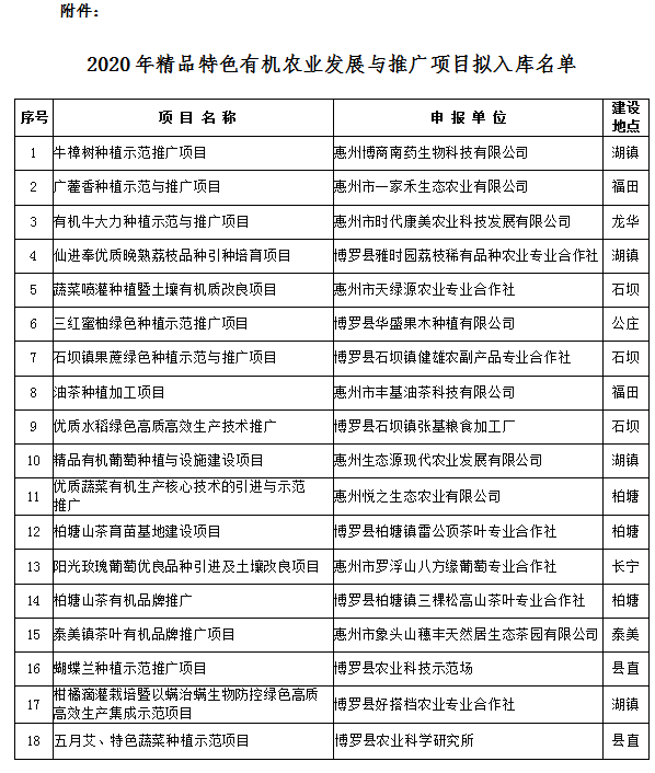 根據《博羅縣涉農資金統籌整合實施方案(試行)》(博府[2019]11號)和《2020年度精品特色有機農業發展與推廣專項資金項目儲備入庫申報指南》(博農技[2019]24號)的通知精神要求,在各鎮(街道)申報基礎上,我單位對項目申報材料進行了資格性條件復核,現予以公示(名單見附件),如有異議,請在公示期內向我單位提出書面意見(加蓋單位公章或簽署真實姓名)。